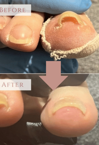 巻き爪による痛みを、テーピングでしのいでいましたが、耐え切れず来院いただきました。