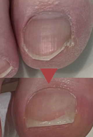 写真左のように爪が厚く変形しご自身で爪が切れない状態となっていました。